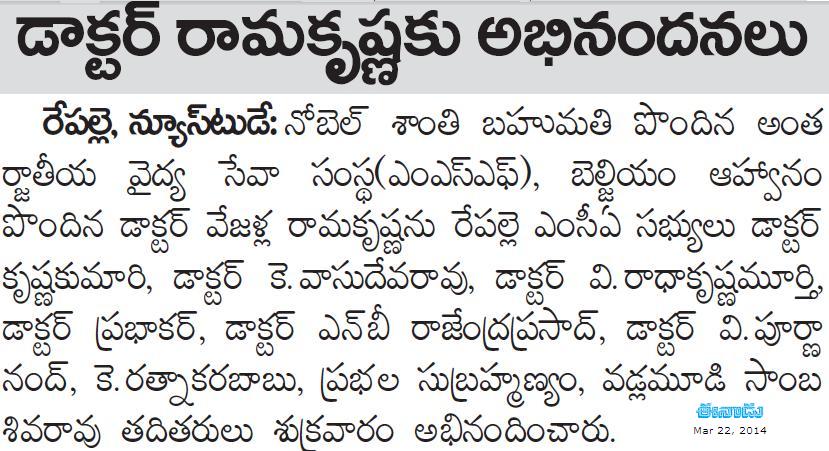 Repalle MCA Dr goes to Belgium/Europe - Felicitations 21.03.2014