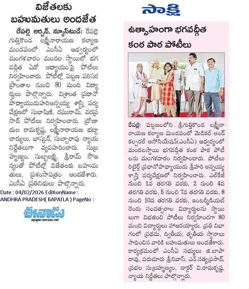ఉత్సాహభరితంగా భగవద్గీత కంఠస్థ పోటీలు 31.01.2023 మెడికల్అండ్కల్చరల్అసోసియేషన్ఆధ్వర్యంలో భగవద్గీత కంఠస్థ పోటీలు నిర్వహించారు. పోటీలను ప్రధమ వర్గంలో ఆరేపాక యోక్షిత్, కూనపరెడ్డి వరీష్కార్తీక్, పి.జగదీష్లు, ద్వితీయ వర్గంలో సిహెచ్రూపేశ్వరి, బొలిశెట్టి సుమశ్రీ, సిహెచ్భార్గవ్లు, తృతీయ వర్గంలో గూడవల్లి వెంకట శివమణికంఠ, సిహెచ్శ్రావ్య, కే.భవ్యశ్రీ, చతుర్ధవర్గంలో డి.పూజిత, ఎం.నాగసాయి, బి.అభిషేక్లు వరుసగా ప్రథమ, ద్వితీయ, తృతీయస్థానాలు సాధించారు. అదేవిధంగా ద్వితీయవర్గంలో చిరువోలు ఆరాధ్య, తృతీయ వర్గంలో పాగోలు హేమవర్షిణిలు ప్రోత్సాహక బహుమతులకు ఎంపికయ్యారు. కార్యక్రమంలో ఎంసీఏ మాజీ ఉపాధ్యక్షుడు డాక్టర్వేజళ్ల ప్రకాశరావు, వడ్లమూడి సాంబశివరావు, వీ.లక్ష్మీనారాయణ, తదితరులు పాల్గొన్నారు.